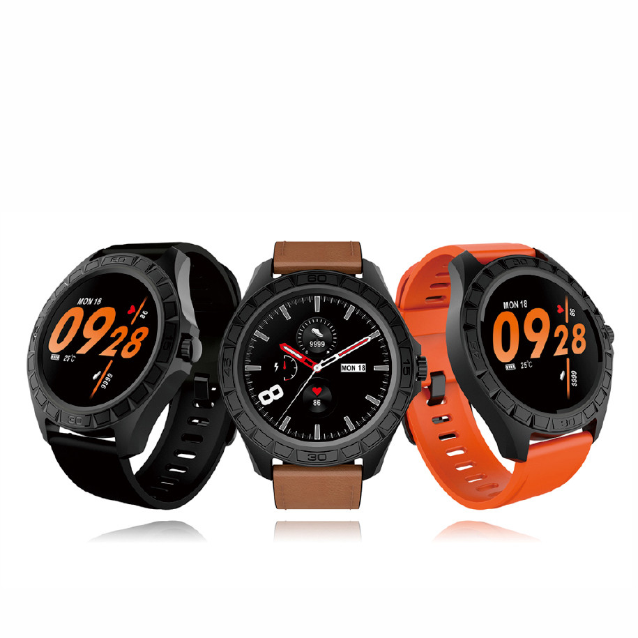 ●1.3 inch full-touch round screen ●watch face is exclusive and personalized ,APP push available ●24hrs continuous real-time heart rate monitoring ●3000mAH capacity battery, 1 5days lasting endurance ●supporting 23 modes of sports ●supporting 17 national Ullanguages ●with IP68 waterproof grade ●equiped with leather watchband and TPU watchband, good for activities of business and sport ●customization service available, including color boxes, watchband color, ●imprinting logo on buckle